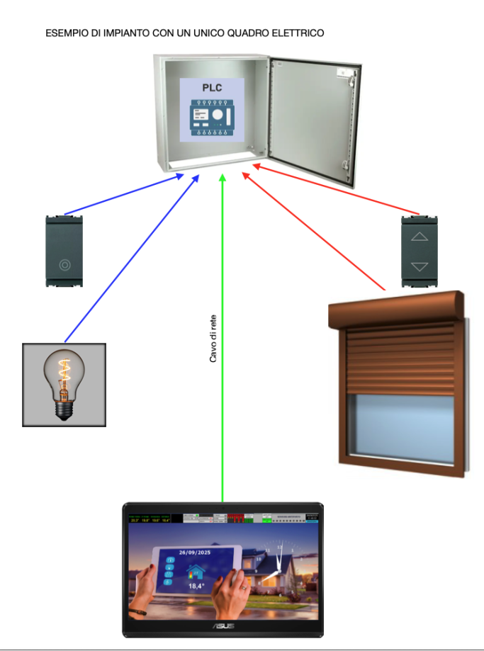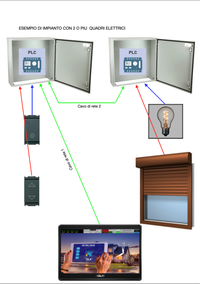 Nel caso siano presenti più quadri elettrici, il funzionamento rimane invariato: un pulsante può essere collegato a un quadro, mentre la lampadina può essere gestita da un altro. Il sistema è progettato per garantire flessibilità totale e coerenza operativa, indipendentemente dalla distribuzione fisica dei componenti.